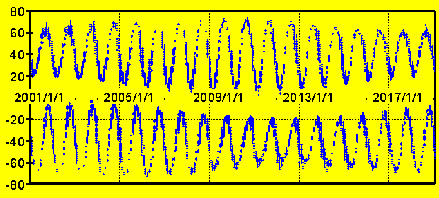 上段が月齢3付近の月の夕方の西空での傾き(弦と地平線との間の角度)の変化。 下段は、月齢26付近の月の明け方の東空での傾きの変化。いずれも中央の横軸に近い方が 傾きが小さい。横軸は一目盛りが1年、縦軸の単位は角度の度。