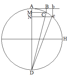 ACとAcはどちらも無限小の円弧である。だから、どちらもそれぞれの弦(線分ACと線分Acの長さ)と差がない。(弦というのは、たとえば、線分AHが円弧ACHの弦である、ということから類推しなさい)それは、円弧が無限小なので線分と差がないからである。また、BCとbcは、どちらも点Aでの接線Abに垂直である。ADは円軌道の直径である。CM⊥AD、cN⊥ADである。また、∠DHA、∠DcAのように円周上にあるどの点における角もすべて直角になる。(直角とは90°のことである)だから三角形ACDは直角三角形でCMはその直角から斜辺に下ろした垂線である。直角三角形AcDにおいては、cNがその直角から斜辺に下ろした垂線である。だから、直角三角形の辺の相似関係から