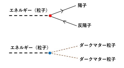 ここで、「エネルギー(粒子)」というのは、何かわかりませんが、ビッグバンの「火の玉」に当たるエネルギーで、何らかの素粒子が担っていると思ってください。これがどれだけ物質化するかは、図の赤小丸、青小丸で示したところの結合の強さで決まり、これは素粒子の理論に依存します。しかしながら、ダークマター粒子ができたということは、何らかの青小丸の結合があったわけです。としますと両図の「エネルギー(粒子)」に共通部分があるなら、それを利用すれば、図11上のような、物質の衝突によるダークマターの創造も原理的に可能になります。または、これの時間をひっくり返した(左右を反転した)図も作図可能です。これで、あちらの世界とこちらの世界がエネルギー(粒子)で繋がったことになります。