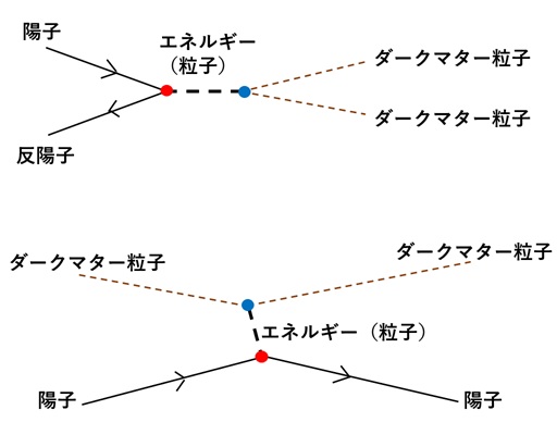 図11: 上:陽子・反陽子対の衝突によるダークマター粒子対の生成、下:ダークマター粒子と陽子との弾性散乱