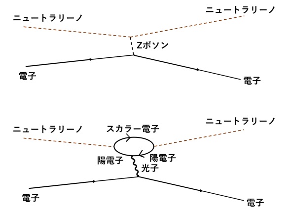 図8 ニュートラリーノと電子との弾性散乱。上:中性カレントによるもの。下:荷電粒子のループを仲介したもの。