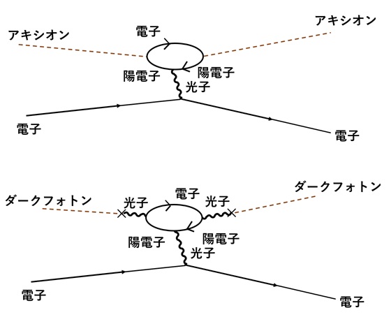 図9 上:アキシオン(上辺の粒子)と電子との弾性散乱。下:ダークフォトンと電子の弾性散乱。