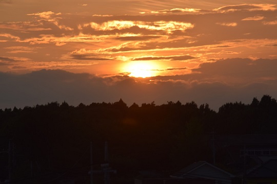 また、西側の窓から見ると、夏至の前後の半年近くは夕日が森に沈むことがわかりましたので、その景色をご紹介します(写真4)。こちらはベランダがあるので、西空の彗星等の観察は東よりずっと容易だと思います。光害はどっちもどっちです。