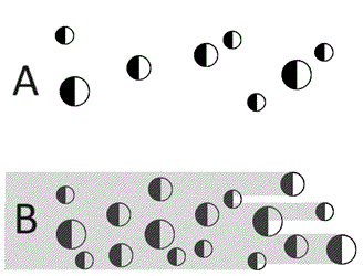 図1:A ケース2で、土星環が球体の星くずで出来ている場合、それぞれは半月のように欠けて光る。B ただし、星くずの密度が混んでいるところでは、日陰ができて、日当たりがかなり悪くなる