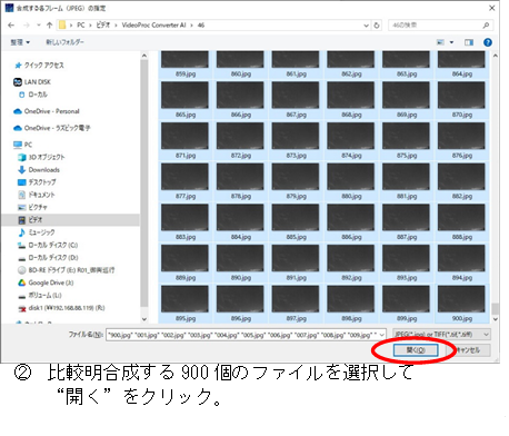 A 1分900個 のフレーム静止画のファイル全選択し“開 く”をクリック。