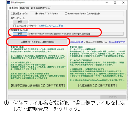 ファイルの場所とファイル名を設定。“C画像ファイルを指定して比較明合成”をクリック。