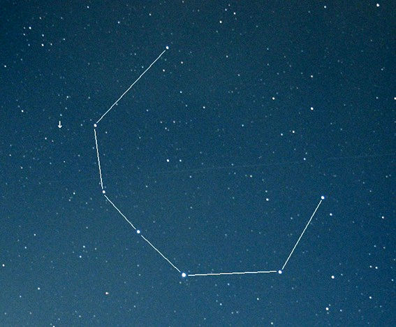 写真:かんむり座、矢印は再帰新星T CrB